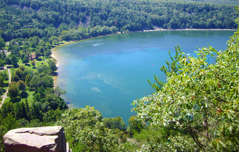 The western bluff rises up about 500 feet in elevation, making for a challenging climb if you’re a young kid. But my son handled it like a champ by badgering me into letting him ride on my shoulders. At the time, he was just young enough to get away with it. At the top we took goofy pictures of ourselves and regular pictures of the surrounding landscape. . Then we ate lunch in the sun on a rocky outcropping overlooking the lake. Afterwards, we wandered the bluff as my son explored every possible nook and cranny of the wooded hills. After spying anything interesting (like a really large slug) and asking what it was, he would follow-up by asking if it was all right to touch it. I remember being a kid, so most of the time I told him he could. But a few times I pointed out that he was just looking at bird poop. Later, we walked down to the lake for a swim, and then we ate ice cream in concession building. But then the rain started coming down.